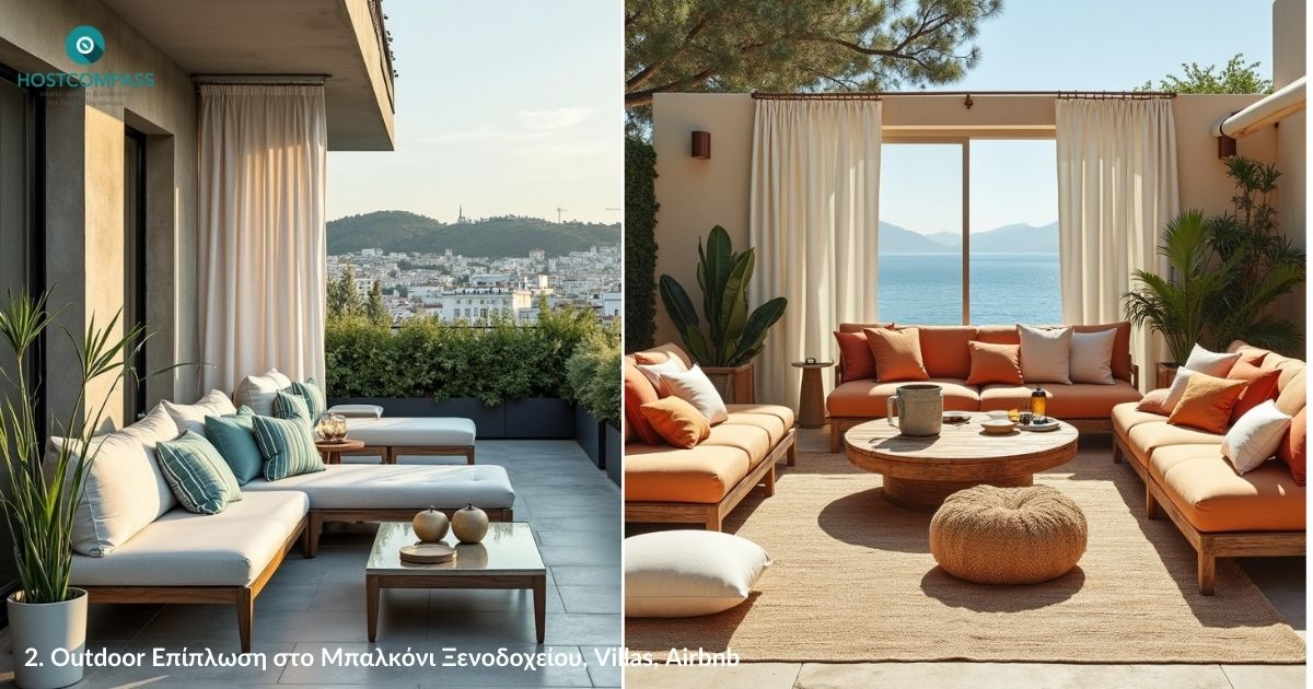 Η HOSTCOMPASS σας προτείνει να εφαρμόσετε ένα συνδυασμό χαμηλών επίπλων, όπως ένα χαμηλό ανάκλιντρο, πολυθρόνες lounge και τραπεζάκια σε διαφορετικά ύψη, με βάση από θερμικά επεξεργασμένο ξύλο (thermowood) ή αλουμίνιο ηλεκτροστατικής βαφής, τα οποία παρουσιάζουν υψηλή αντοχή σε υγρασία, θερμοκρασιακές μεταβολές και θαλάσσια αλμύρα — ιδανικά για μεσογειακά μπαλκόνια.
